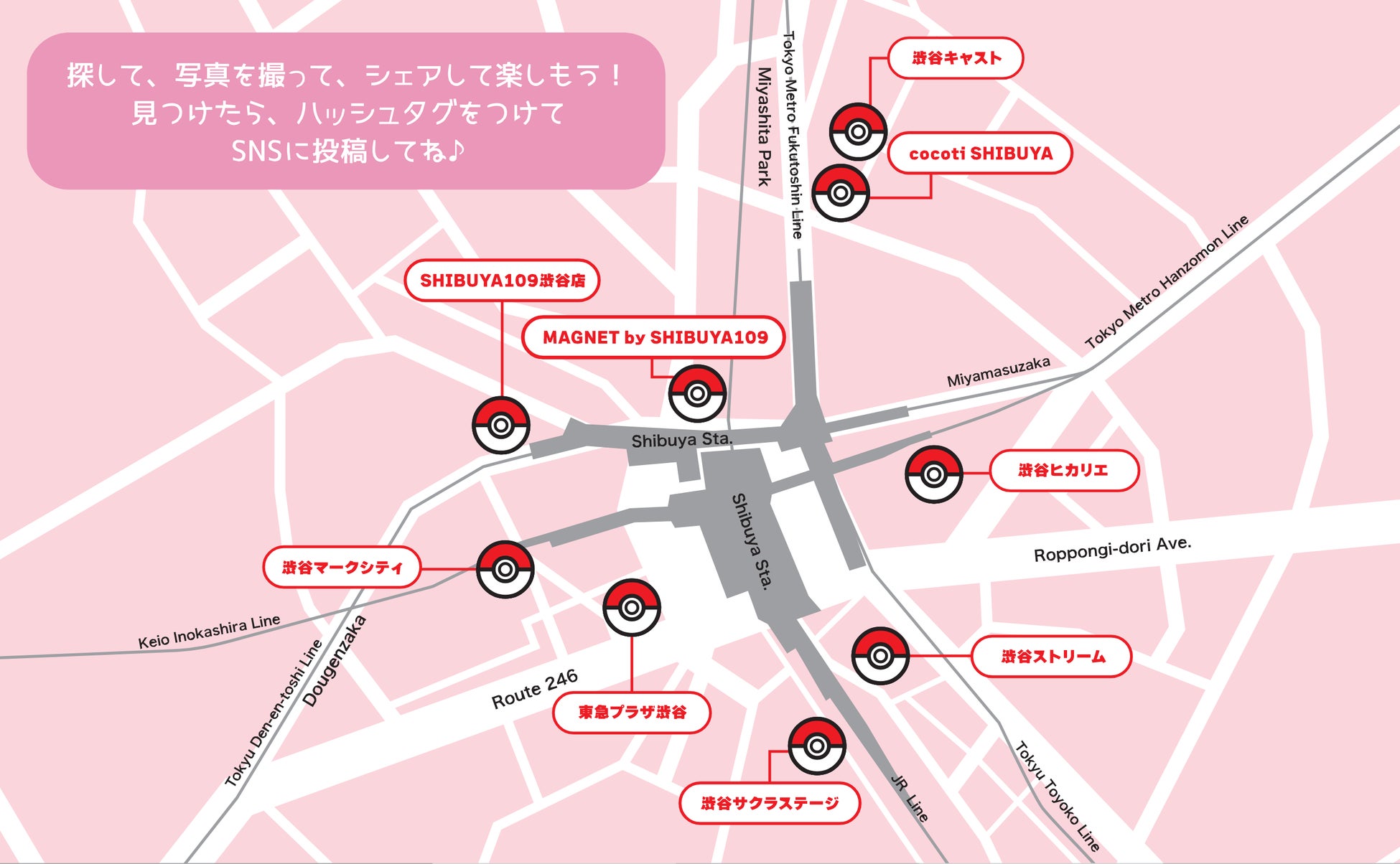 本イベントは、渋谷駅周辺エリアの9施設を舞台に展開します。東京・渋谷を訪れる人たちが、「ポケモンと楽しく思い出に残る瞬間を撮れる」ということをコンセプトに、各施設に現れるさまざまなポケモンを探して、自由に撮影していただけます。