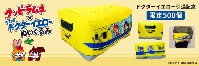 2025年1月引退になるドクターイエロー(T4)とウサギとリスのキャラクターでおなじみカクダイ製菓より1963年の発売以来、昭和を代表する駄菓子クッピーラムネとがコラボしたぬいぐるみ!