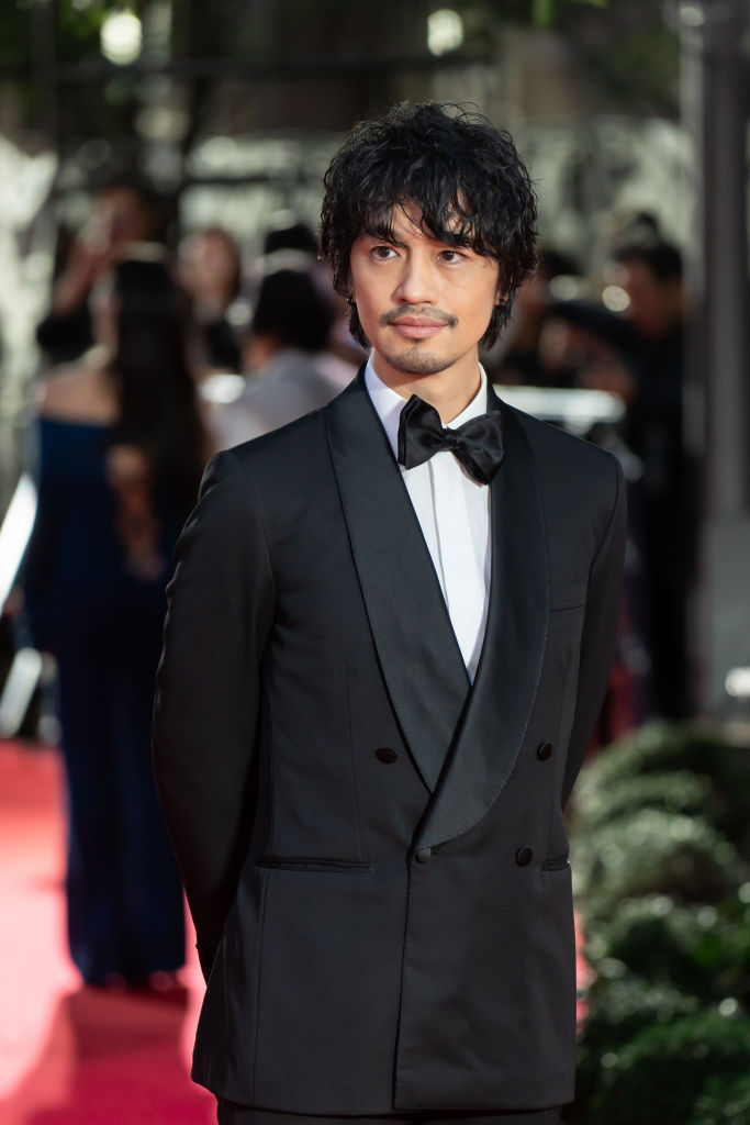 俳優のディーン・フジオカは、スパンコール刺繡が施されたピークドラペルのブラックタキシード、コットンのイブニングシャツ、シルクアクセサリーを着用。