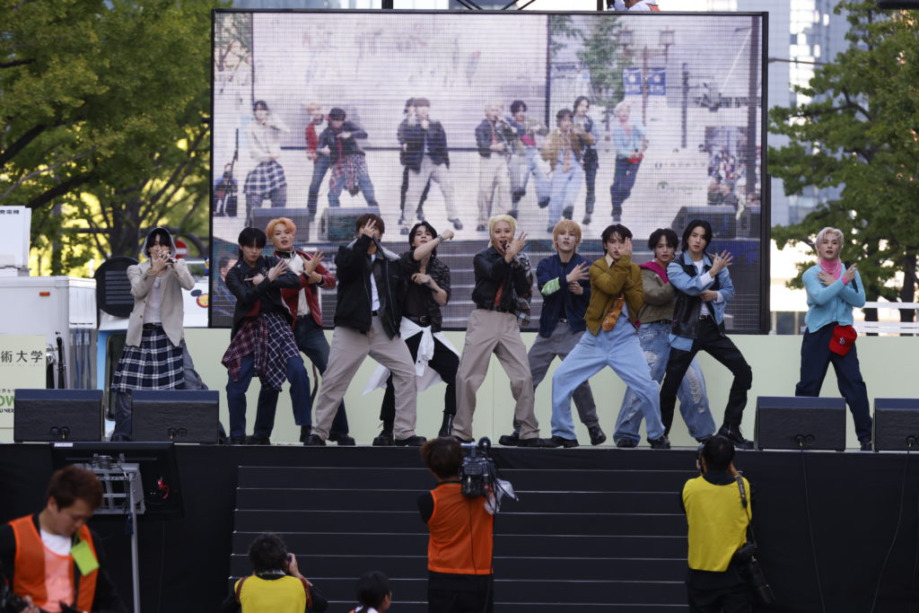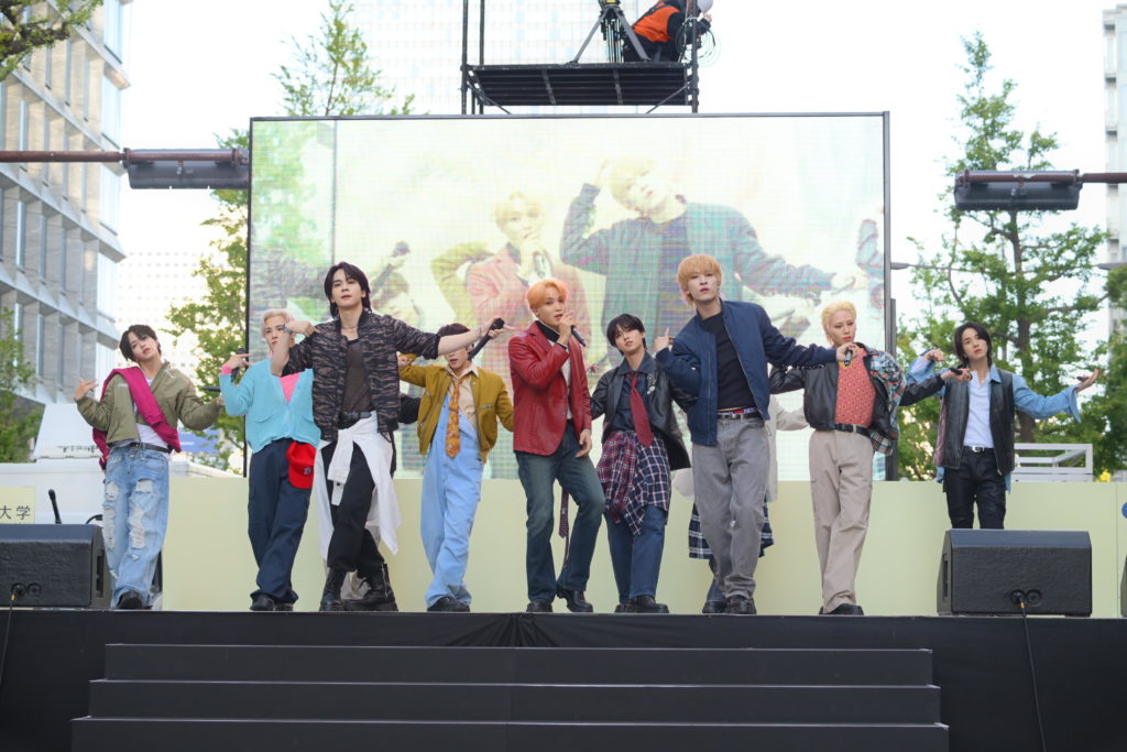 そして、御堂筋の中央に設置されたメインステージにJO1が集結。5月にリリースし、JO1の持つ明るく強いパワーを象徴する楽曲「Love seeker」、さらにJO1がカバーリリースしている浜田雅功と小室哲哉のユニット・H