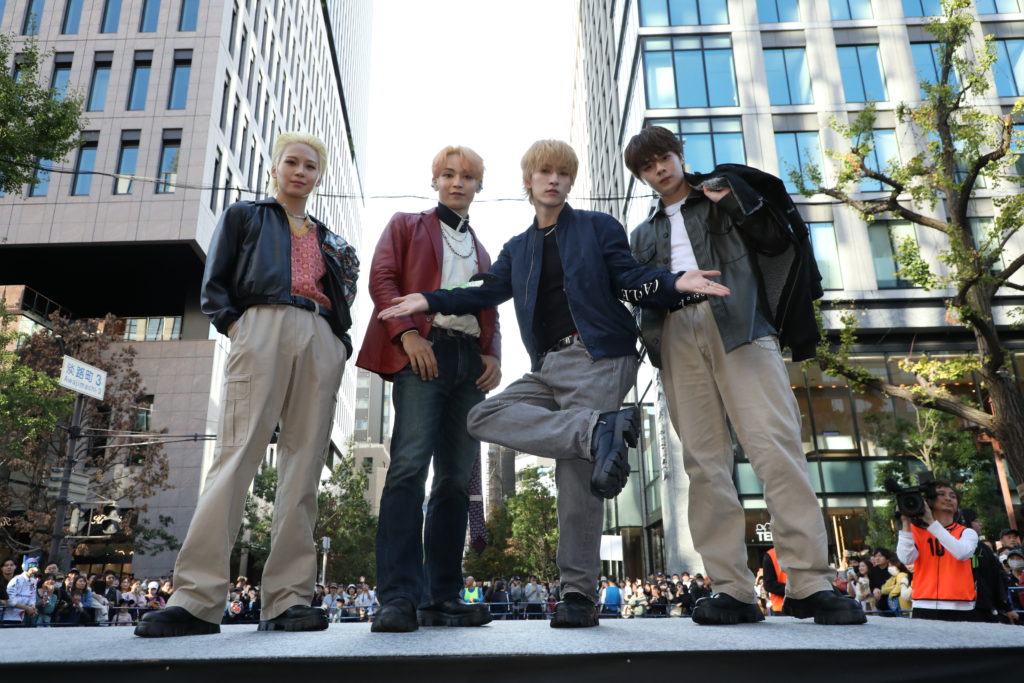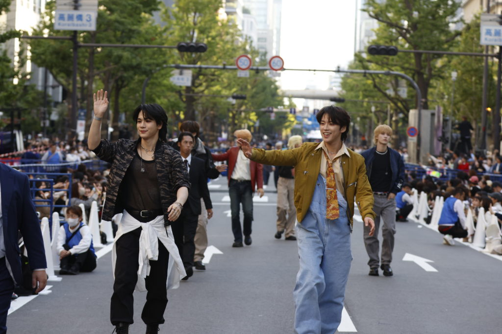 大阪のメインストリート御堂筋を1日限定でランウェイに変え、エンターテインメントや日本文化、パフォーマンスなどを発信するイベント「御堂筋ランウェイ」は、今年、過去最長となる約2kmわたって開催されました。JO1は昔から繊維の街として知られる大阪ならではの企画、ファッションランウェイにメンバー11人揃って登場。ショーのキーワード「リユース・アップサイクル」をテーマにした装いで、世界に類をみない約1.1kmのランウェイを歩きました。他のモデルたちが淀屋橋から本町へと歩いていく一方で、JO1は本町から淀屋橋に向かって逆走するかたちで北上。