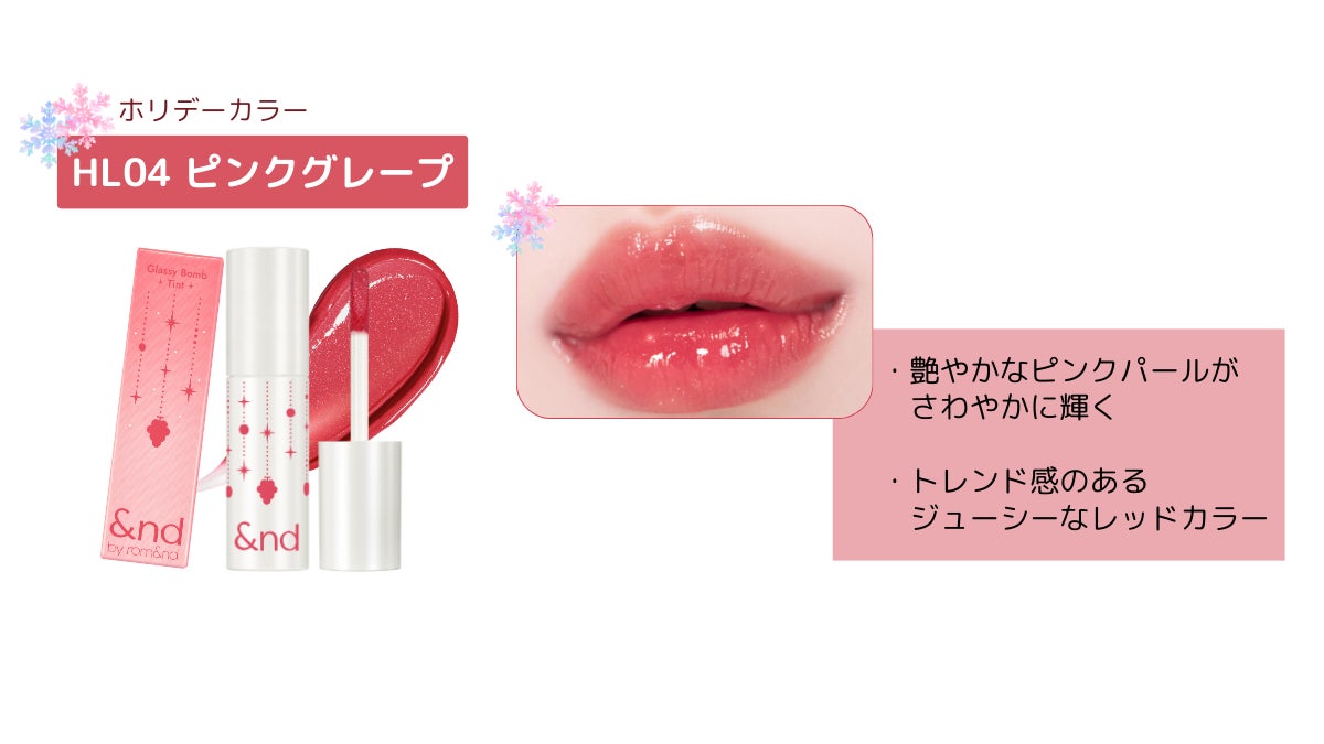 韓国コスメブランド「rom&nd(ロムアンド)」と株式会社ローソン(本社:東京都品川区、代表取締役 社長:竹増 貞信、以下「ローソン」) との共同開発ブランド「&nd by rom&nd(アンド バイ ロムアンド)」から、ホリデーシーズンにぴったりなラメ入り「グラッシーボムティント」2色を、2024年11月5日(火)より全国のローソン店舗(※1)にて数量限定(※2)で発売いたします。「&nd by rom&nd(アンド バイ ロムアンド)」の日本正規販売代理店は、韓国コスメの卸ならびに専門店「COSME Re:MAKE」の運営を展開する株式会社韓国高麗人蔘社( 所在地:東京都新宿区、代表取締役:金拏侖)です。