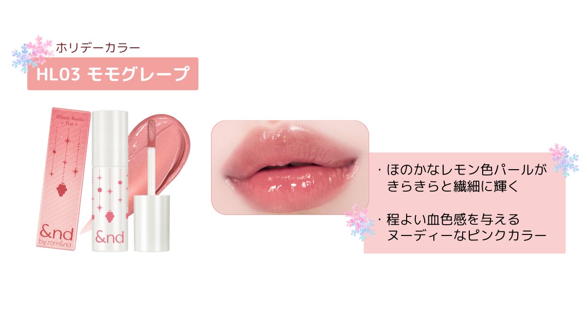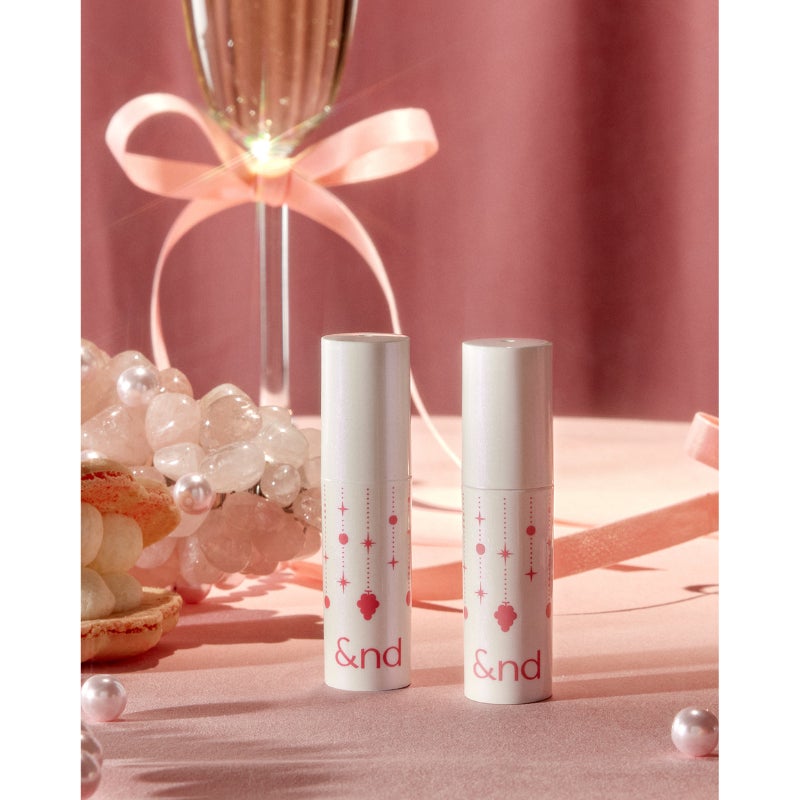 「&nd by rom&nd(アンドバイロムアンド)」。 このたび、そんな&nd by rom&ndの中でも人気を誇る商品「グラッシーボムティント」からホリデーシーズンにぴったりのティント新色2色を発売いたします。 新色2色はブランド初となるフルーティーな“シャルドネの香り” 付きで、キラキラとかわいく光るラメ入り。ホリデーシーズンのウキウキとした気分を倍にして楽しめるアイテムとなるでしょう。