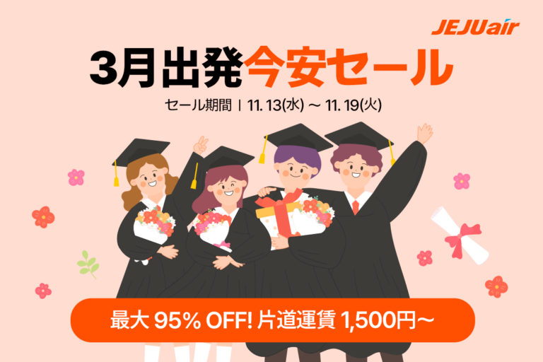 11月「今安セール」は、11/13(水)午前10時から11/19(火)午後5時まで1週間行われる。対象路線は、▲東京(成田)·大阪(関西)·福岡·名古屋(中部)·広島·松山·静岡·鹿児島·大分·札幌(新千歳)·沖縄(那覇)=仁川 ▲大阪(関西)=金浦 ▲東京(成田)·大阪(関西)·福岡·札幌(新千歳)=釜山路線で、最低片道運賃1,500円から販売する。搭乗期間は2025年3/1(土)から3/29(土)までで、会員ランクに応じて最大6,000円の追加割引も提供する。
