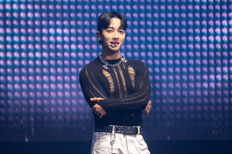 場内に濃いスモークが焚かれ、一面⻘い照明に染められて雨だれと宗教儀式を思わせるミステリアスな音が響いたかと思うと、ステージの大画面には大作映画のモンスターのように、燃え尽きた街に一人佇むイ・ギグァンの姿。一瞬で会場をその世界観に没入させると、真っ赤な照明とレーザーが暴れる中、前面と背中に十字架をあしらい赤いビジューをちりばめたブラックの衣装でイ・ギグァンが登場し、昨年リリースした1stフルアルバムから初披露の「Predator」で公演がスタート。緊張感の中にもしなやかさが光るパフォーマンスと特別バージョンのアウトロに、会場も「イ・ギグァン! イ・ギグァン!」と声援を送る。続く「She’s Bad」では、シルエットを生かす照明によって彼のダンスの美しさがより一層際立つ演出で客席の目を奪った。そして間髪入れずに「Donʼt Close Your Eyes (D.C.Y.E)」へ突入すると、ますます大きくなる掛け声に応えて、彼も会場をアジテートし熱狂を巻き起こした。