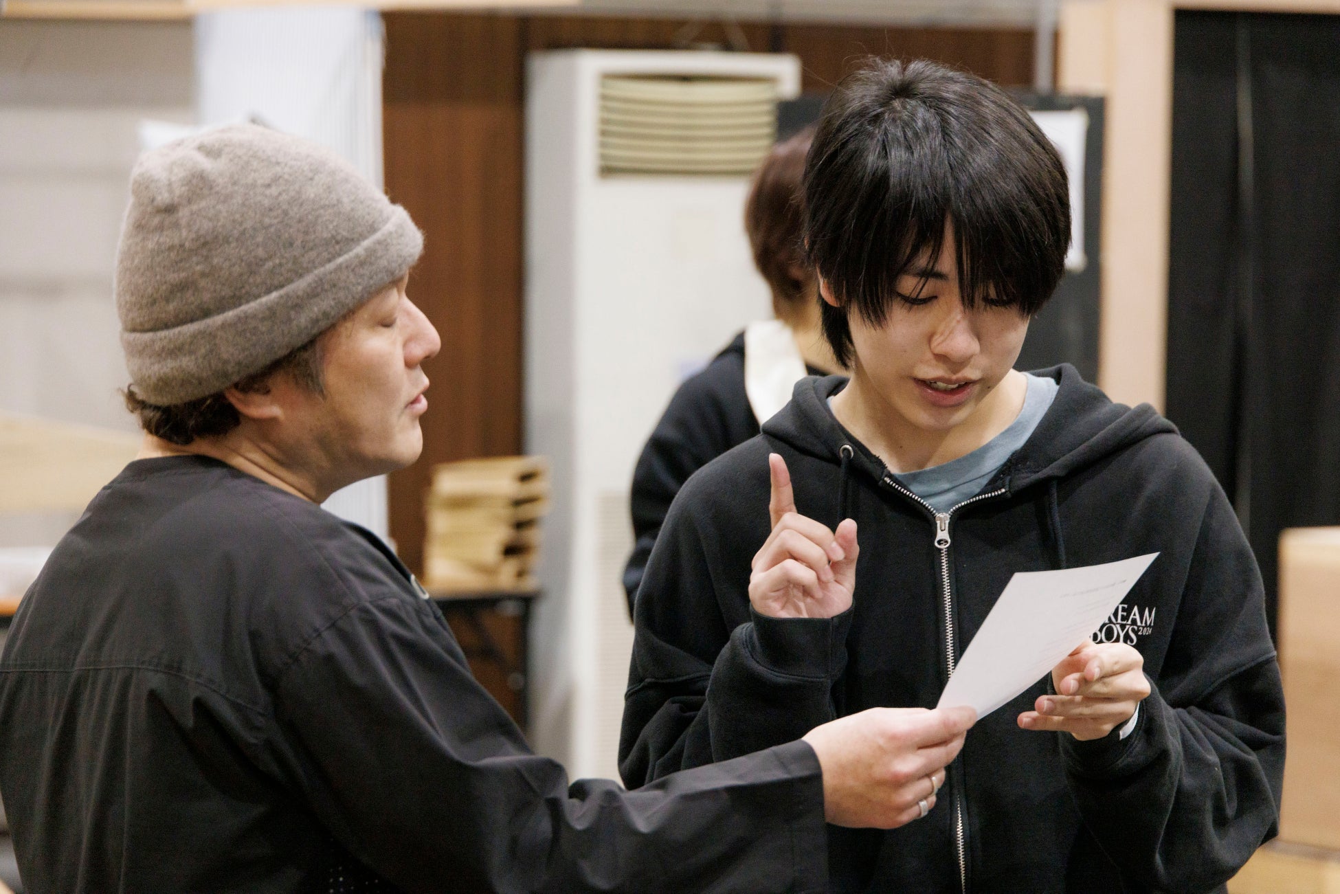 その後、劇中で歌われる歌とダンスの練習も行われた。まずはキャストたちが音楽に合わせて踊ってみせる。前日に覚えたという振りだが、北川と小田はすでにしっかりと形になっていた。小林は、その場で次々とミザンス(立ち位置)を決めていき、ダンスを完成させていく。富塚から「エアーギターをしてもいいですか?」と提案が上がると、即座に採用し、エアーギターが生きるパートを作る。アイディアに溢れた小林が次々と演出をつけていき、あっという間に1曲完成した。