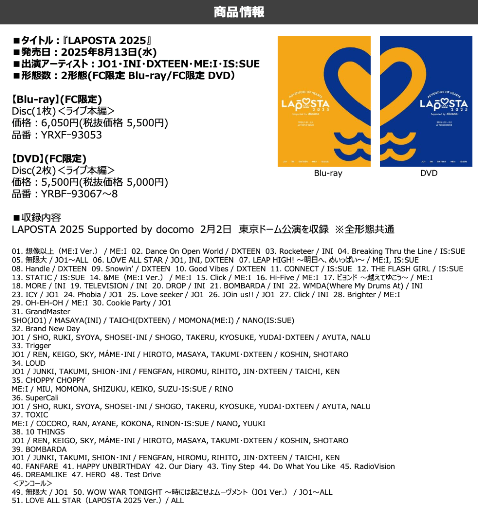 2025年2月に東京ドームで開催された『LAPOSTA 2025 Supported by docomo』のBlu-ray&DVDを8月13日(水)に発売することが決定しました。