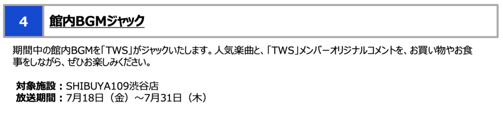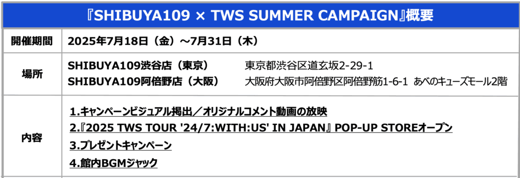 1、期間中、SHIBUYA109渋谷店の外壁懸垂幕をはじめ館内外に『SHIBUYA109 × TWS SUMMER CAMPAIGN』のビジュアルを掲出いたします。