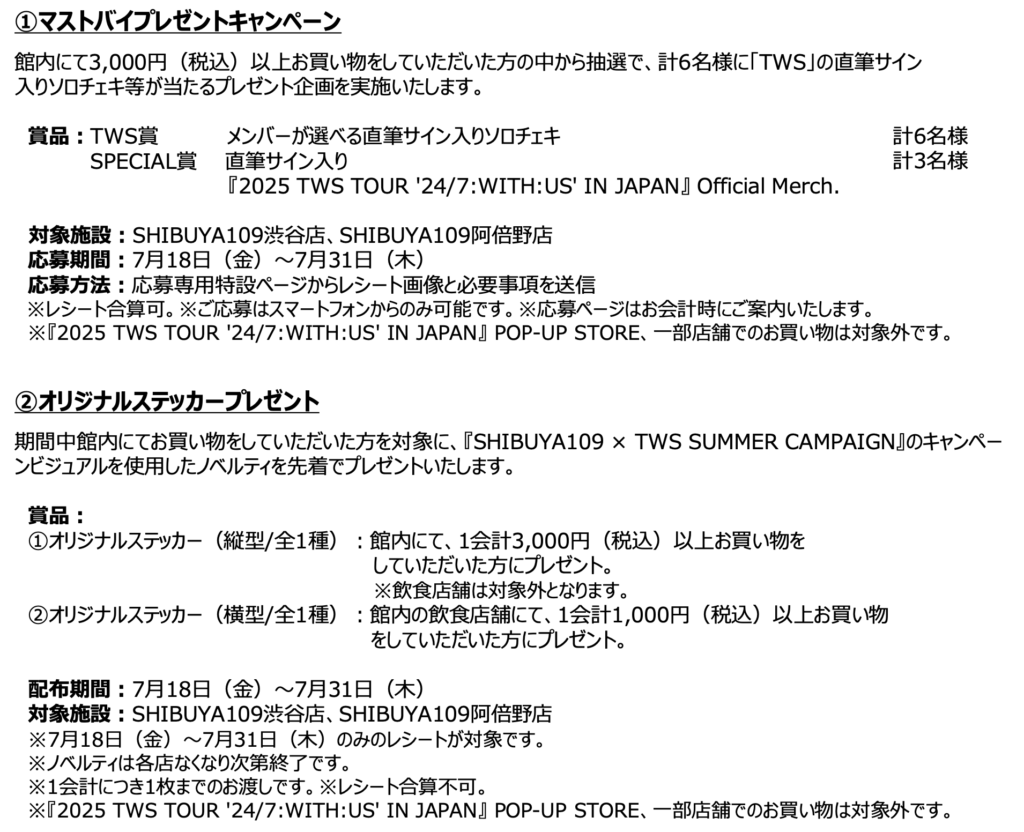 株式会社SHIBUYA109エンタテイメント(本社:東京都渋谷区、社長:石川あゆみ)は、東京・渋谷で運営する「SHIBUYA109渋谷店」、「SHIBUYA109阿倍野店」(大阪府大阪市)2施設にて、2025年7月18日(金)~7月