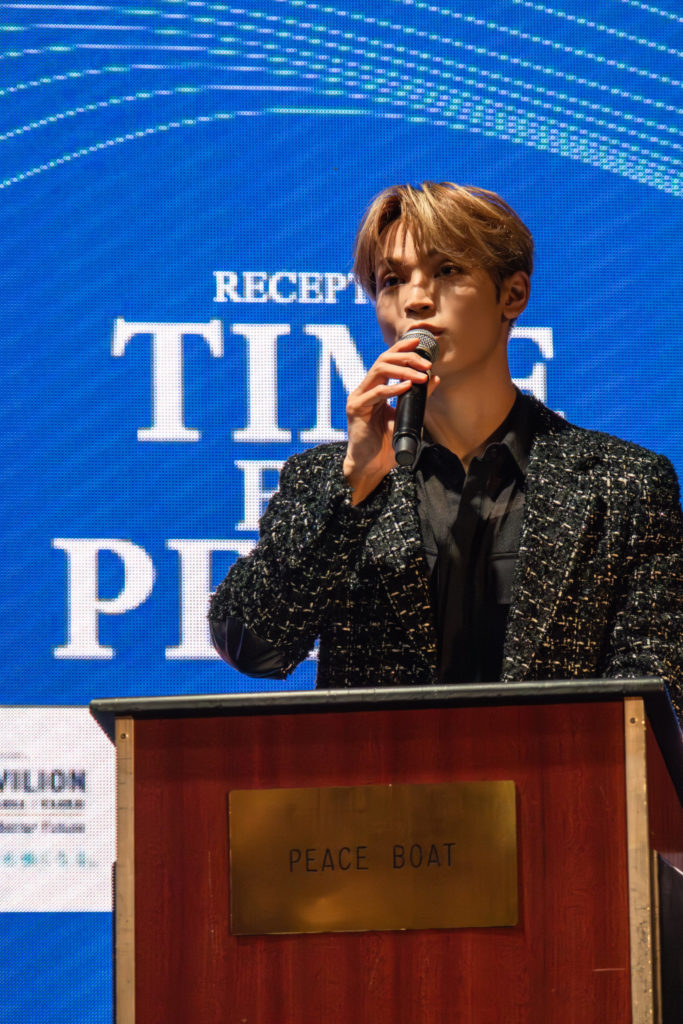 中満泉氏(国連事務次長‧軍縮担当上級代表)による講演や、二村英仁氏(ヴァイオリニスト、UNESCO Artist forPeace)によるヴァイオリン演奏の後、JO1リーダーの與那城奨が英語でスピーチ。手始めに「皆さん少しお疲れでしょう」と