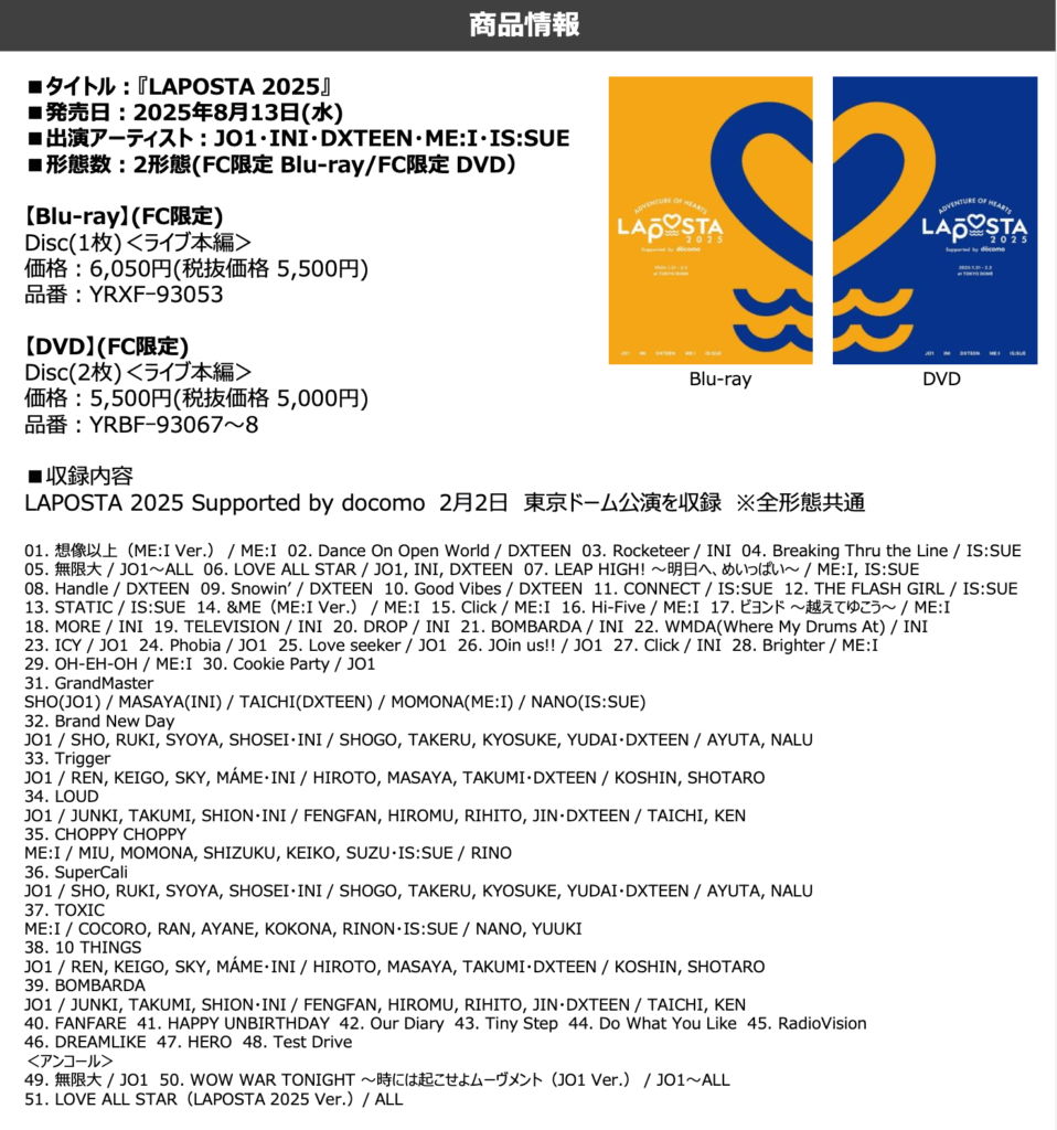 ME:I・IS:SUE)が一堂に会し、東京ドームとその他周辺施設を舞台に1月27日(月)~2月2日(日)の1週間にわたりさまざまなライブやイベントを開催。本日発売のBlu-ray&DVD『LAPOSTA 2025』は2月2日(日)の東京ドーム公演の映像を収録しており、各アーティストの人気曲はもちろん、LAPOSTAでしか観られない豪華ユニット曲やカバー、さらにはスペシャルゲストを交えたパフォーマンス含め全51曲が収録されています。
