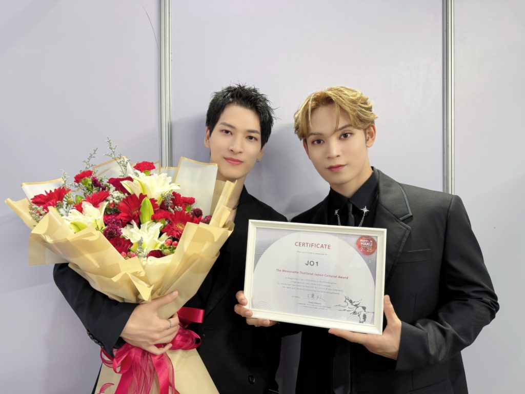 グローバルボーイズグループJO1が、日本とタイの文化交流の歴史において 価値ある功績を残した人物や団体に贈られる 「The Memorable Thailand–Japan Cultural Award 2025」を受賞しました。そして、メンバーから金城碧海、與那 城奨が代表し、バンコク・シリキット国際会議場LG階、展示ホール5・6にて開催中の「NIPPON HAKU BANGKOK 2025」の開会式と表彰式に登壇しました。