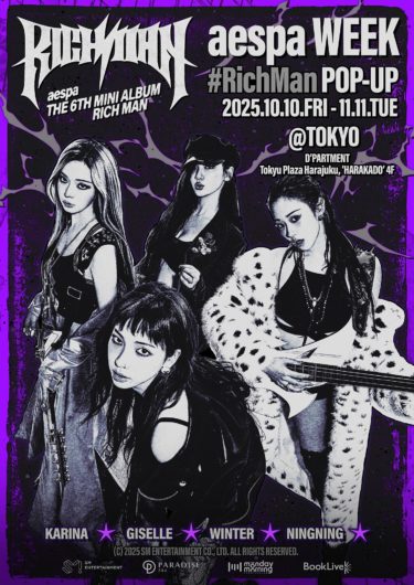 aespaの6枚目となるミニアルバム『Rich Man』の発売を記念して開催される、『aespa WEEK #RichMan POP-UP @TOKYO』は、韓国やアメリカにて先行開催され好評を博したポップアップイベントです。この度の開催が3カ所目となり、日本では「D’PARTMENT」のみの限定開催となります。公式グッズの発売や、購入特典の配布、各種展示などaespaファン必見のイベントとなります。