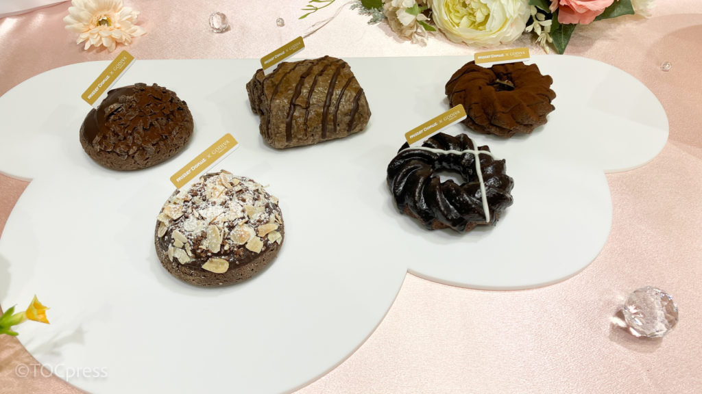 今回の新商品は5種のラインアップ。1月9日(金)よりミスタードーナツ各店舗にて発売開始。それぞれ上品さを意識してシンプルながらに味わいが特徴。また、テイクアウト限定セットも登場。Mister Donut×GODIVAのコラボレーションは今回で2度目となる。