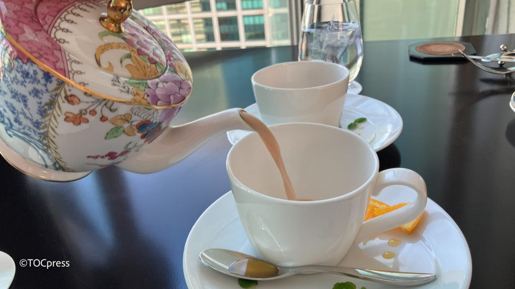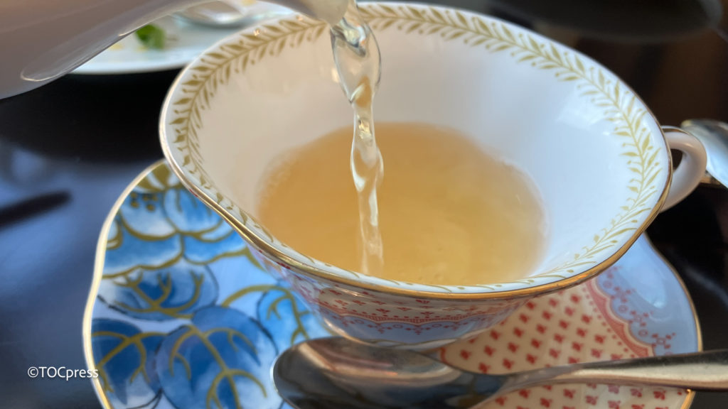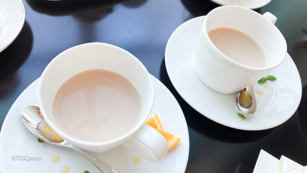 平日限定ウエルカムティー 「ハニーミルク・オランジェ」はSIROCCO TEA のルイボスティーに香り豊かなタンジェリンオレンジとハイビスカスをブレンドしてスッキリとした味わいのフルーツティーにミルクとハチミツを合わせて、濃厚なホットミルクティーに仕上げた逸品。”味変”でティースプーンの蜂蜜を途中で入れて味わうのも素敵でしたよ。
