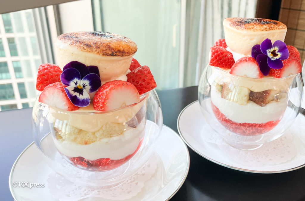 一番頂上にあるシブーストは、提供直前にキャラメリーゼするとのこと。パリッとした食感と甘苦いバランスが最高です。そして、ふんだんに使用したストロベリーはこの季節のご褒美♡カスタードクリームもたっぷりなのに甘さ控えめで、どんどん食べ進められちゃいます。底の部分にみえているストロベリーゼリーの中にはベリーソースも入っていて爽やか。見た目から映え!です。