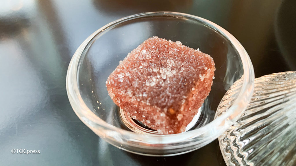 いちごのピューレをかためた、しっかりとしたゼリー。少しずとかじりながらお紅茶を楽しむのがおすすめ。