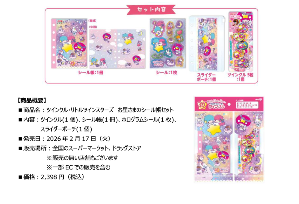 株式会社 明治(本社:東京都中央区、代表取締役社長:八尾 文二郎)が販売するたまご型のミルクチョコレ ート「ツインクル」は、2025 年 11 月に発売 45 周年を迎えました。2026 年 11 月までの間、アニバーサリーを記念した 様々な企画を展開中です。その一環として、株式会社サンリオのリトルツインスターズとコラボレーションした「ツインクル×リ トルツインスターズ お星さまのシール帳セット」を、2月17日(火)に発売します。