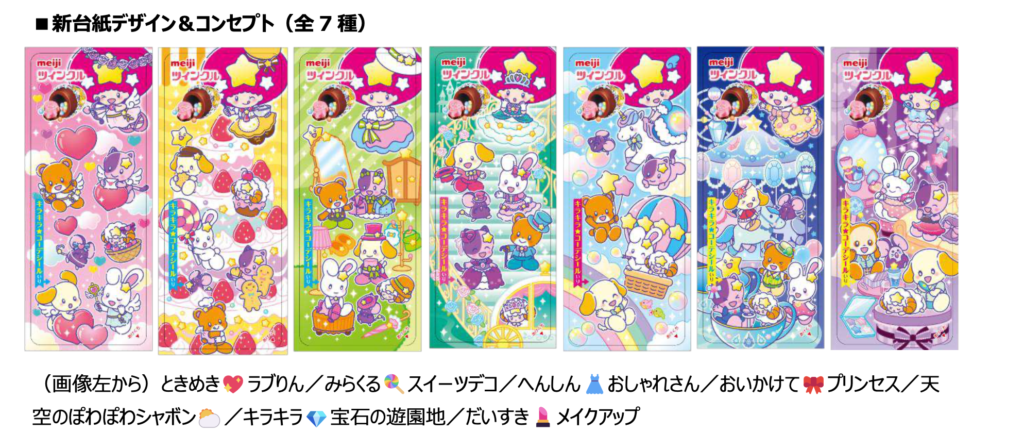 近年、SNS を中心に大きな話題となっている「平成女児」ブーム。かわいらしいシール手帳やシール交換も、再び大流 行しています。1980 年から販売を開始し、特に 1990 年代、平成女児の皆さんから人気を博したチョコレート菓子であ る「ツインクル」もまた、発売当初からおまけとしてシールが封入されており、カラフルな銀紙に包まれたコロンとした出で立ち と、振るとシャカシャカと中に入ったキャラクターのチョコレートやハートラムネ、こんぺいとう、ミンツの音が鳴り、食べるまで何 が出てくるかわからないワクワクで、今なお世代を超えて愛されています。