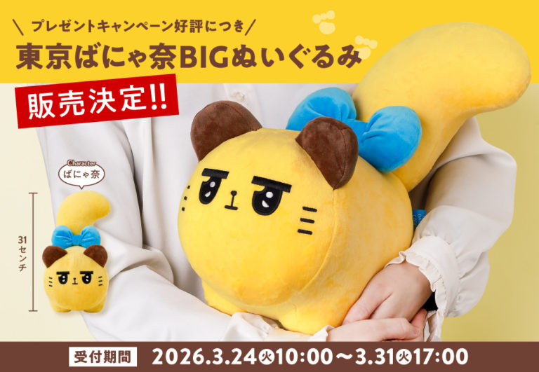 株式会社グレープストーン(本社:東京都中央区銀座)が展開する「東京ばな奈ワールド」 とCHOCOLATE Inc.が共同開発した新クラフトクッキーブランド「東京ばにゃ奈クッキーズ」は、2026年3月24日(火)より公式オンラインショップ「パクとモグ」にて『東京ばにゃ奈 BIGぬいぐるみ ばにゃ奈』を販売いたします。