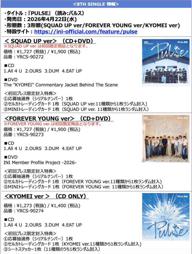 「Song Card」はTikTokで“INI”と検索すると、4月22日(水)にリリースする8TH SINGLE『PULSE』より、本日音源
