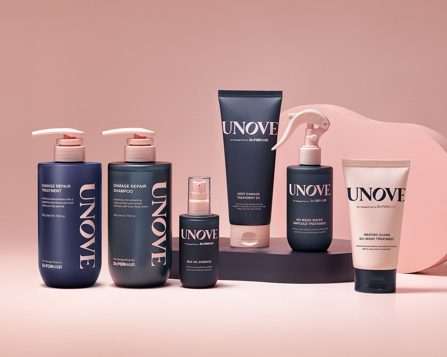 UNOVEのヘアケアラインは2019~2023年に韓国最大のH&Bチャンネルであるオリーブヤングシャンプー部門にて5年連続受賞した同社のグローバルヘアケアブランドDr.forhairの技術力で誕生したパーソナルケアブランドです。 UNOVEは「羨望の柔らかな髪へ」導くために、ダメージ髪に本質的な栄養を与え、柔らかさや香りを基にムードをまとうことができるのが特徴です。