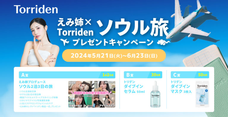 マルマンH&B株式会社(本社:東京都千代田区、代表取締役社長:溝田 勝彦)は、韓国のスキンケアブランド「Torriden(トリデン)」の対象商品購入レシートによるご応募で、韓国ソウル2泊3日ペア旅行や、トリデン人気商品が当たる『えみ姉×Torridenソウル旅プレゼントキャンペーン』を、2024年5月21日(火)20:00から2024年6月23日(日)23:59まで実施いたします。
