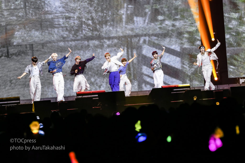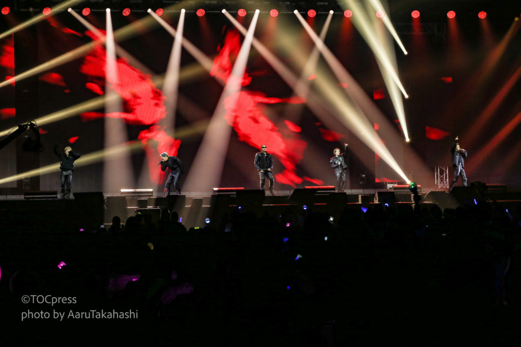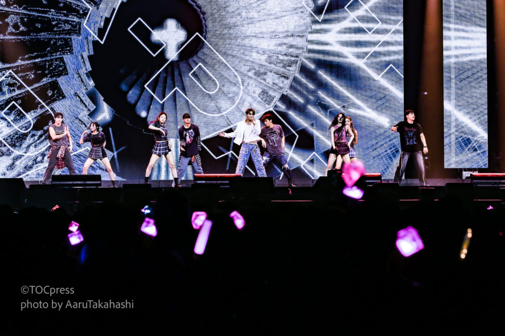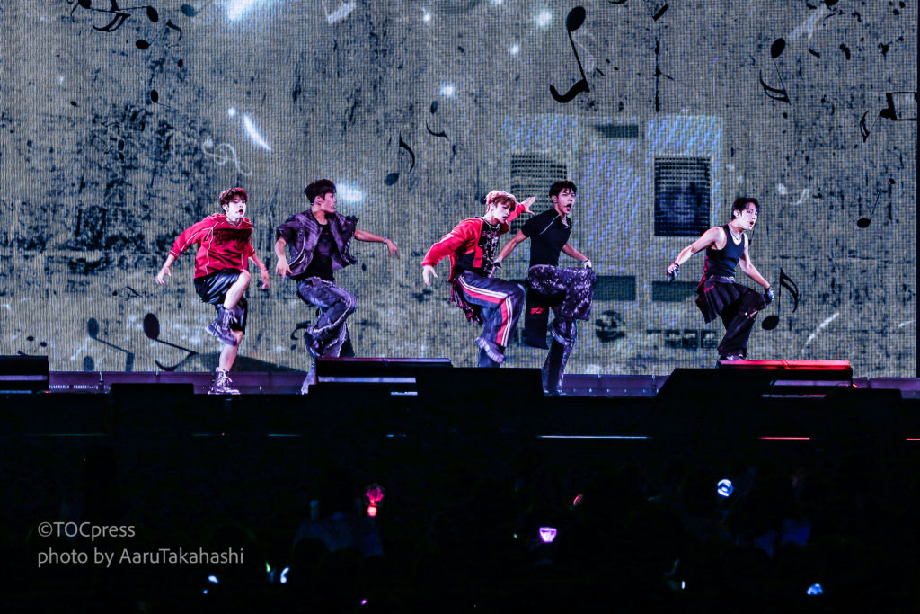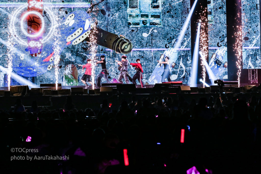 「ROCK THANG」は赤く燃えるイメージの1曲目。炎も吹き出すステージで、会場のボルテージは爆上げ。激しく熱くダンスでトップバッターの名に恥じない堂々としたステージを披露した。「Goosebumps」を披露し、最後はポップな曲「Paradise」でスタートを飾った。